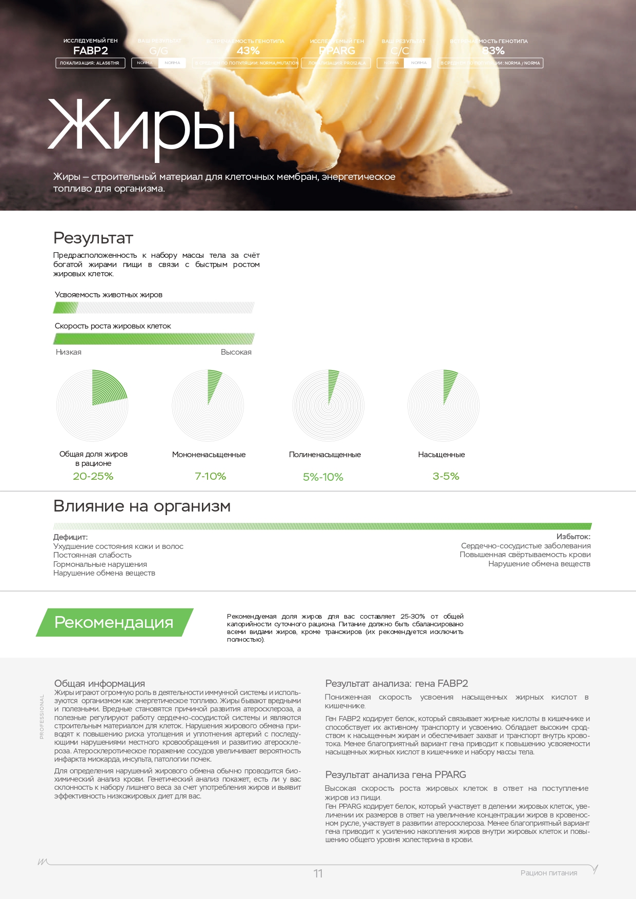 Этот ДНК анализ показывает, к каким физическим нагрузкам человек расположен генетически, а также какие продукты (содержащие определенные элементы) лучше употреблять в пищу. У каждого человека свои цели, кто-то хочет просто сбросить лишний вес, кто-то увеличить силу мышц, а кто-то нарастить огромные мускулы. Для получения максимальной отдачи от тренировок мы рекомендуем пройти наш генетический тест для фитнеса в Зиме.